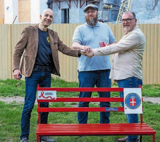 Vor einem Kinderheim in Odessa in der Ukraine steht eine rot angestrichene Bank. Sie ist ein Zeiche
